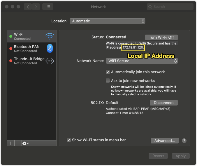 System Preferences > Network 설정으로 가서 왼쪽 패널의 와이파이를 클릭하면 Status: Connected 아래에 Wifi is connected to~라는 것이 보인다. 여기서 로컬 ip 주소를 확인할 수 있다.