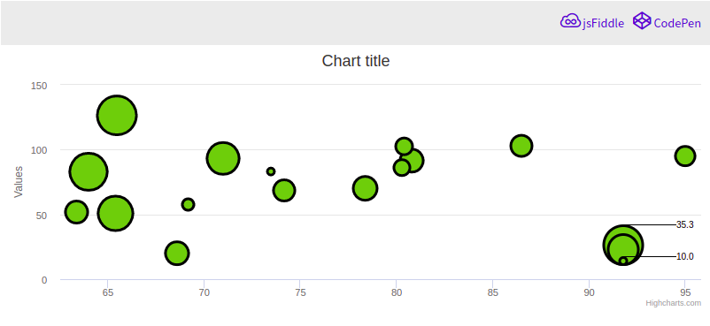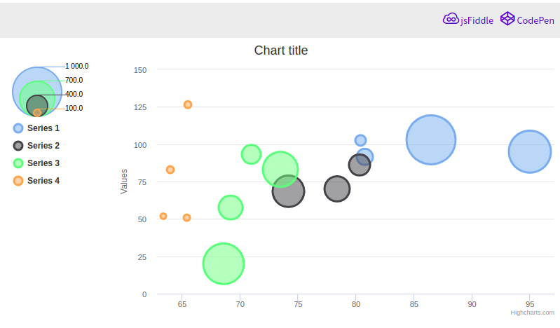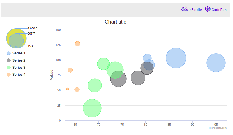 사용을 위해선 highcharts-more.js 라이브러리가 필요하다. 버블 범례를 나타내기 위해서는, legend.bubbleLegend.enabled값을 true로 바꾸면 된다.