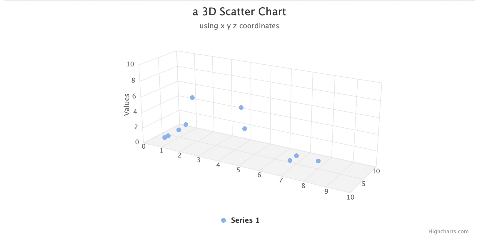 보통의 scatter 차트에서의 x와 y좌표와 더불어, 3D 플러그인은 추가로 z좌표를 추가로 가져 3차 원상에 놓게 된다. 다른 보통의 차트와 비슷하게 좌표들은 배열 혹은 리터럴로 보낼 수 있다.
