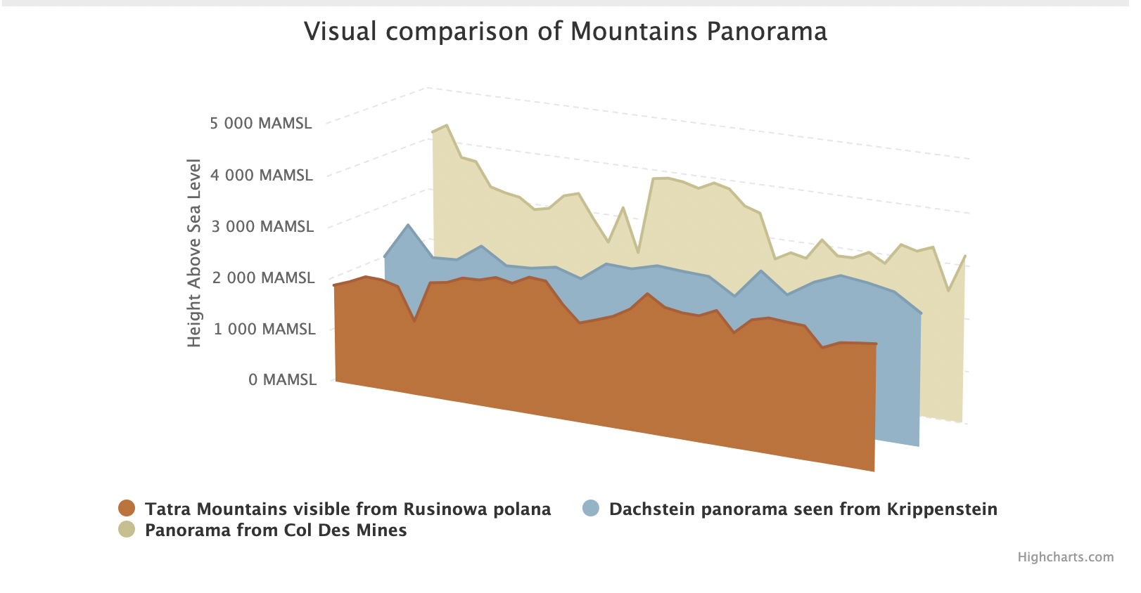 area 타입의 3D 차트는 columns 시리즈와 비슷하게 동작한다. 각각의 area 시리즈를 3차원으로 그리게 된다. 기본 설정으로 area 시리즈의 깊이 값은 25이다.