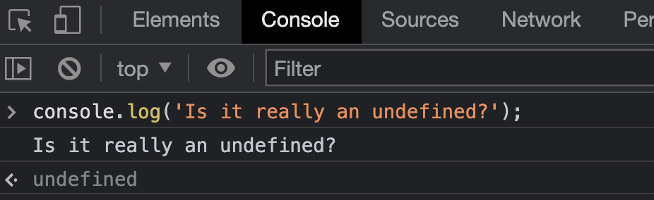여기서 좀더 깊게 들어가 보고 싶다면, 여기 자그마한 팁이 있다. 콘솔 객체의 로그 메서드는 undefined를 반환한다. 브라우저의 dev 툴에서 이를 테스트할 수 있다.