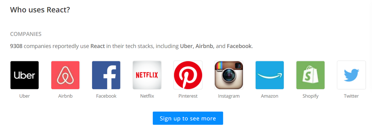 Stackshare에 따르면 9천 개가 넘는 회사에서 리엑트를 사용하고 있다. 포춘 500 기업들도 확인 할 수 있다.