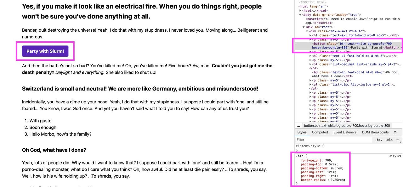 만약 HTML을 기억한다면, 이미 <button> 엘리먼트에 똑같은 클래스를 포함하고 있다. Tailwind는 이러한 스타일을 다른 클래스를 생성할 때 유틸리티 클래스를 포함하거나 적용시킬 수 있도록 한다. 우리의 경우 .btn 클래스가 그러하다.