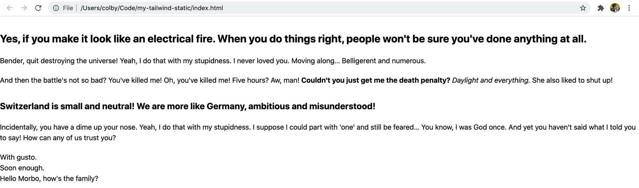 간단하게 새 HTML 파일을 생성하면 된다. 콘텐츠로는 원하는 것 아무거나 사용해도 상관없지만, 필자는 재미를 위해 fillerama.io를 사용했다.