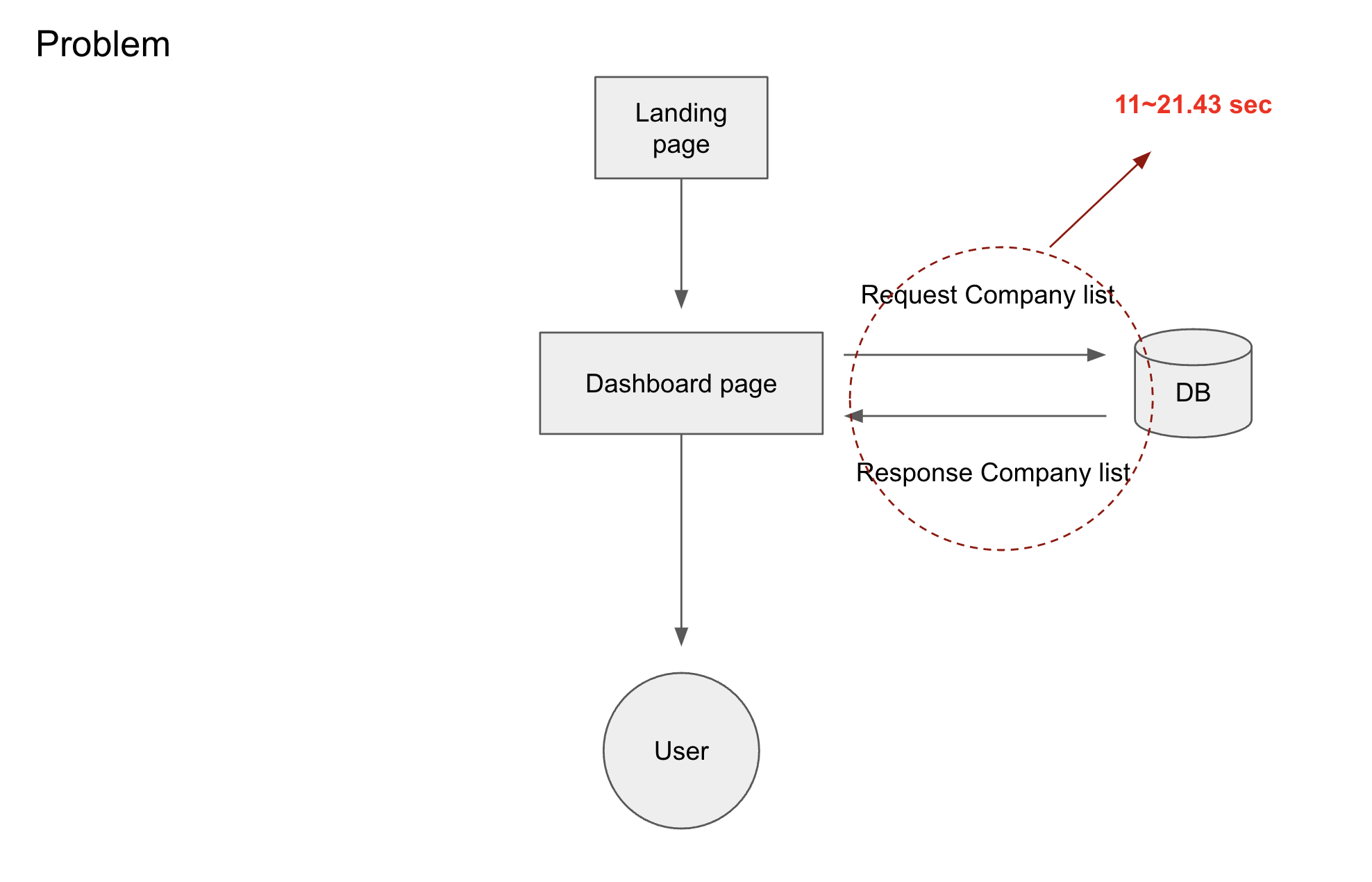 유저가 대시보드에 진입하면 클라이언트는 서버에게 팔로잉하는 회사 리스트를 요청하는 request를 보내게 되는데 응답까지 11초에서 21초의 시간이 걸리고 있었습니다. 단순히 리스트를 보내는데 이렇게 시간이 걸린단 말이야?라고 의아해하실 수 있겠지만,