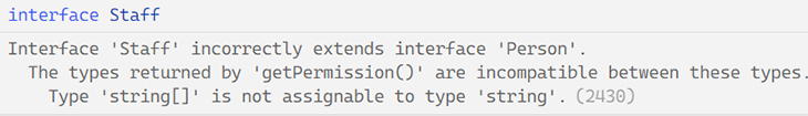 하지만 동일한 프로퍼티를 상속하면서 merge된 타입은 예측하지 못한 결과를 만들어 낼 때도 있습니다. 아래 예문을 보면, Staff 타입의 name 프로퍼티는 never의 타입을 가지게 됩니다. 왜냐하면 stirng과 number 타입이 동시에 될 수 없기 때문입니다.