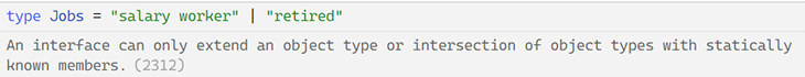 예외적인 상황은 타입이 유니온 타입일 경우입니다. 만약 유니온 타입으로부터 인터페이스를 확장하려고 한다면 다음과 같은 에러를 만나게 될 겁니다.