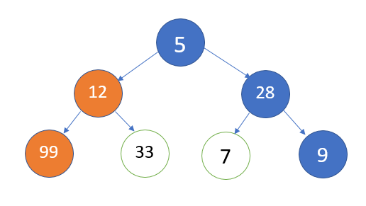예: 아래 트리에서 합이 가장 큰 루트를 찾으라고 한다면, 탐욕적 알고리즘은 전체적으로 더 큰 합을 가지는 오렌지 색이 아닌 근시안 적으로 파란색 경로를 따를 것이다.